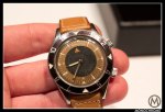 It breathes the 50s aesthetics. The indices, hour and minute hands are finished with an orange-tinted Superluminova coating that matches the luminescence of the Memovox Deep Sea. The crystal is plexiglass just like all of those vintage pieces, and the back of the case wears the same engraving as the original, a diver swimming among bubbles.