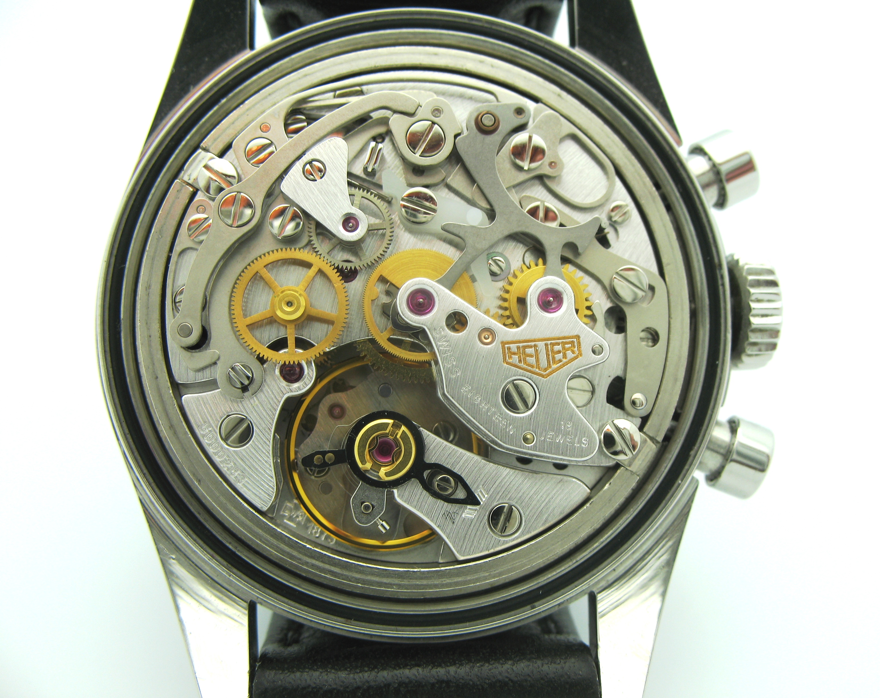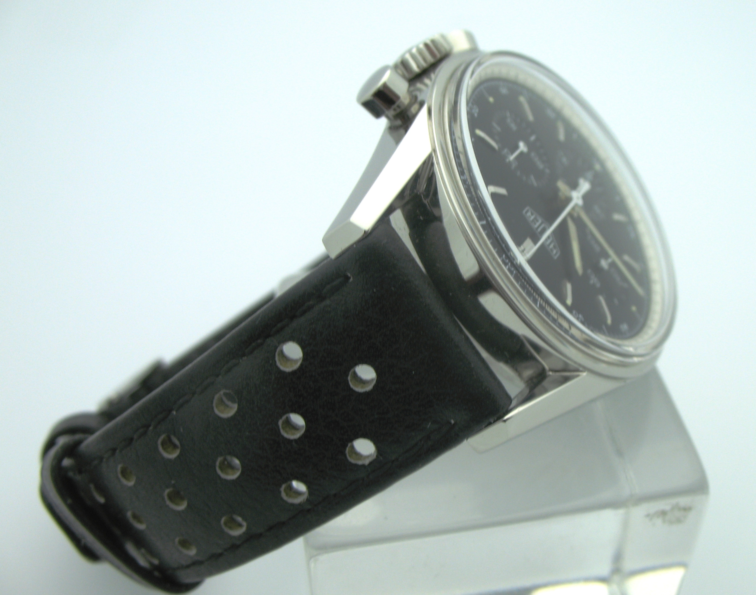 It is a gorgeously simple black dial chronograph with slightly indented sub-dials. It is in stainless steel or 18 karat gold, and either comes on a very attractive perforated leather band. It carries a hesalite crystal and the chapter ring is in white to contrast the face. The screw in case back also displays the Heuer logo as well as “1964 Carrera re-edition”, the model number, and the numbered edition of each watch out of 10,000. Concealed beneath is the work-horse also signed as Heuer, the Lemania 1873. Unfortunately the Valjoux movement was no longer available at the time of the re issue. Ironically the Lemania movement was the main competitor of the Valjoux that powered the original. The famous Omega Speedmaster also shares this movement known to them as the cal 1861.