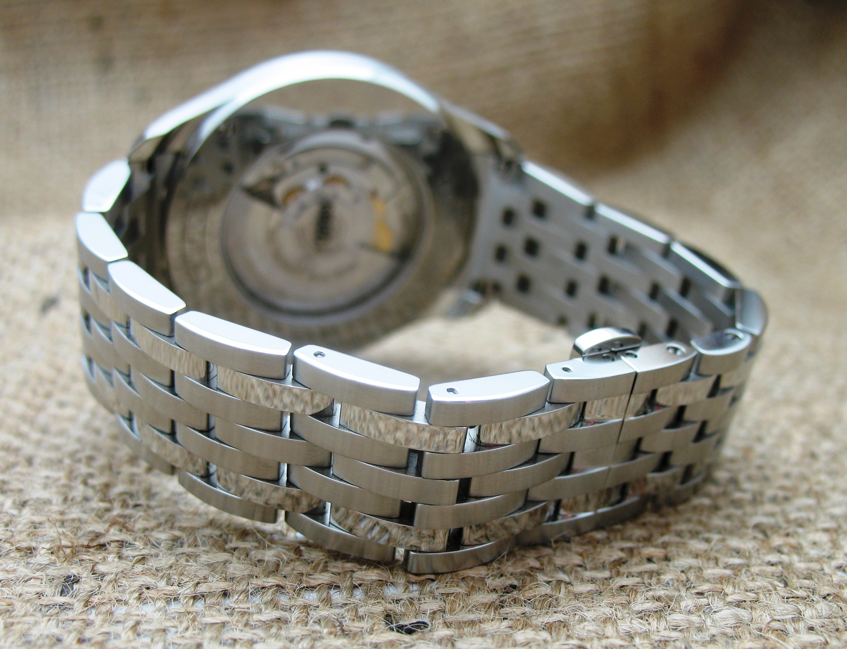 This gave the dial a very classic 50’s look, but also made it extremely easy to read even at a glance.The Clifton comes on leather strap or steel bracelet and in couple of dial variations; silver and black. Other models in the line have complications such as a moon phase or a GMT dial. The automatic version (10099) is powered by the Sellita SW260-1, self winding, 31 jewel movement; it is a 28800 vph movement base on the eta 2824 with a 38 hour reserve. The decoration on the Clifton Automatic’s movement is stunning, with circular grained bridges and a rotor lavished with snailed engraving and Côtes de Genève. This movement is housed in a 41mm stainless steel case with an anti-glare sapphire crystal on the front and back, which is water Resistance to 50 meters. I wore it on a heavy panther style linked bracelet with a nice deployant clasp. The bracelet also came with a few half-links to make the perfect fit easier to attain.