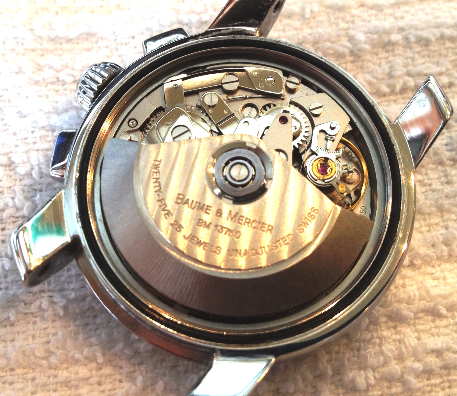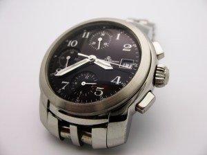 It has a nice heavy feel, beautiful dial with arabic numbers, and a scratch resistant sapphire crystal. It is water-resistant to 100 meters, with the help of a screw down crown. It is powered by a Valjoux 775o automatic movement with some nice embellishments, unfortunately it has a solid case back so you can’t view it.